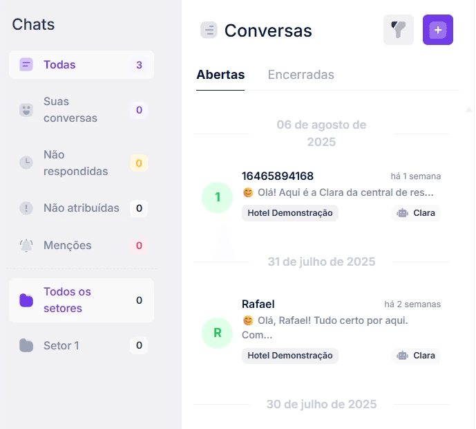 Além do atendimento para reserva, nossa ferramenta também é CRM e pós vendas, podendo ser usada com estratégias de recuperação de carrinho abandonado, resgate de hóspedes antigos, comunicação com hóspede in-house, divulgação de eventos e promoções, etc.